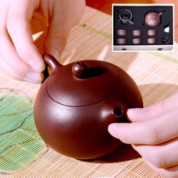 紫砂茶具是用江苏宜兴南部及其毗邻的浙江长兴北部埋藏的一种特殊陶土,即紫金泥烧制而成的。这种陶土,含铁量大,有良好的可塑性,烧制温度以摄氏1150度左右为宜。紫砂茶具的色泽,可利用紫泥泽和质地的差别,经过"澄"、"洗",使之出现不同的色彩,如可使天青泥呈暗肝色,蜜泥呈淡赭石色,石黄泥呈朱砂色,梨皮泥呈冻梨色等;另外,还可通过不同质地紫泥的调配,使之呈现古铜、淡墨等色。优质的原料,天然的色泽,为烧制优良紫砂茶具奠定了物质基础。